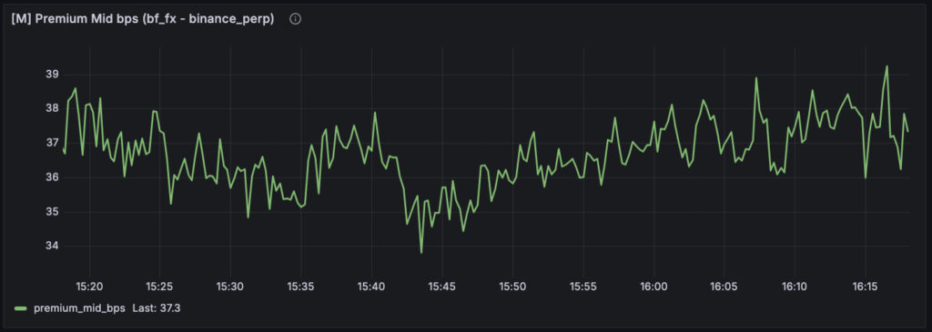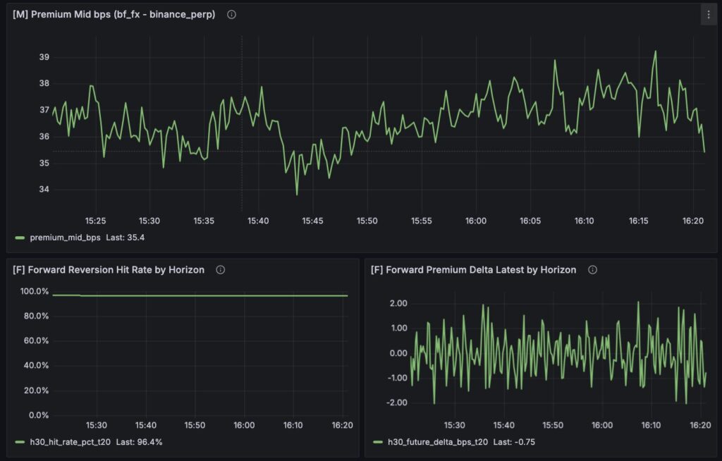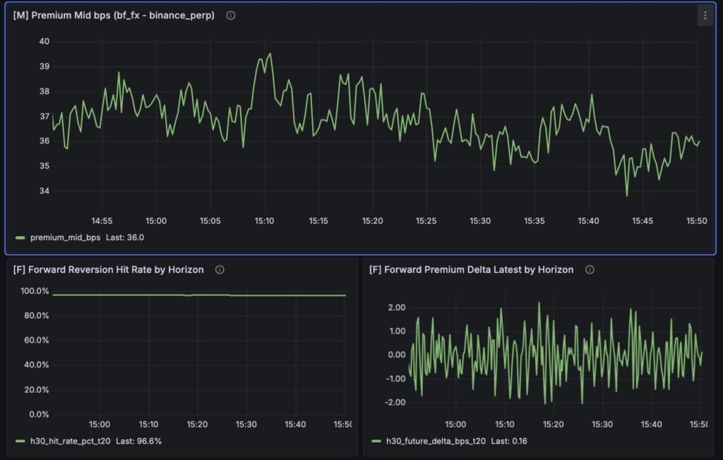 M 系の [M] Premium Mid bps も、かなり示唆的でした。ここでは premium がゼロ近傍で細かく上下しているというより、かなり大きめの正側に張り付いている時間帯が見えています。これは重要です。もし premium が常時ある程度開いたままなら、「threshold を超えたら歪み」と定義している現在のロジックでは、歪みイベントが“特別な発生”ではなく“だいたい常時ONに近い状態”になりやすいからです。つまり今のスクショで見えているのは、瞬間的に飛び出した歪みというより、もともとある程度開いた base 差の上での微小な揺り戻しなのかもしれません。この違和感は、後段の F 系を読むとさらに強くなります。