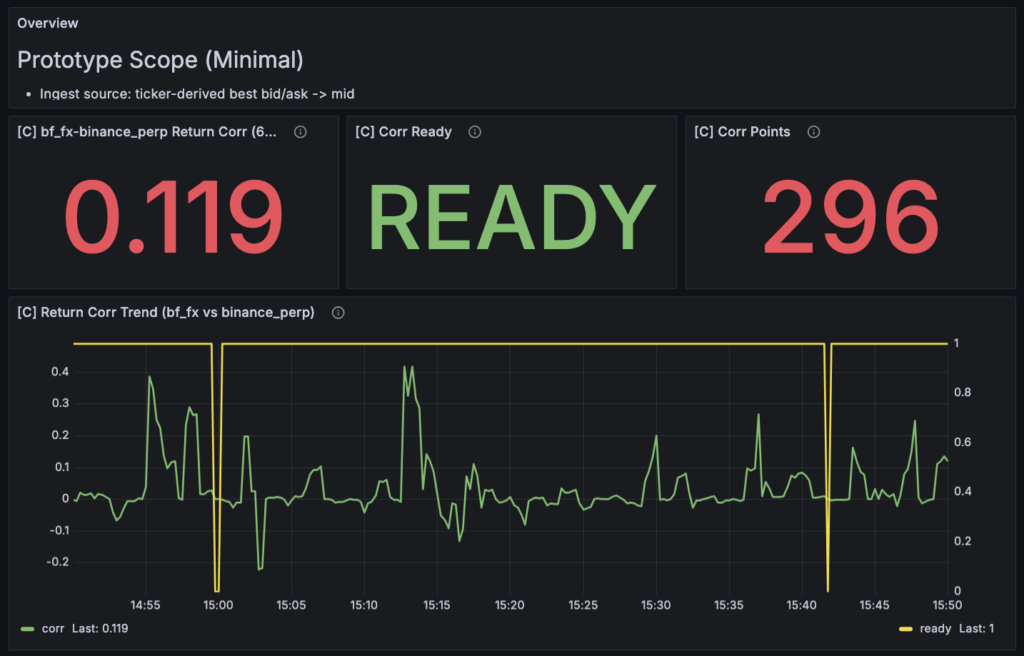要するに今回確定させたかったのは、歪み回帰を「市場間価格差の発生と、その後の縮小」としてまず観測する、という立場です。ここではまだ、それが取れるかどうかも、どちらが先行市場かも、主戦場でどれだけ利益化できるかも決めません。最初に置くのはあくまで、「2市場間にそういう構造があるのか」という問いです。今回の改修全体は、この定義に合わせて前段を整理し直す作業でした。