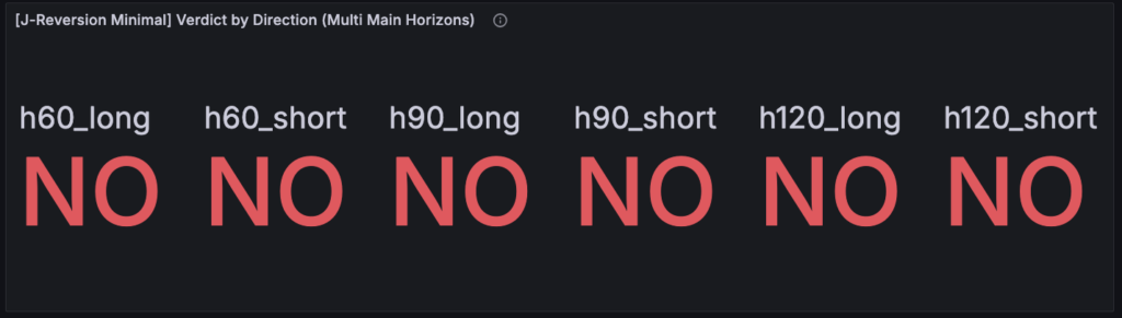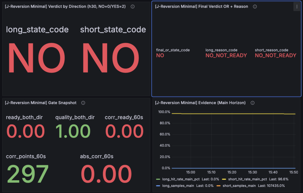 現状の J-Reversion は、設定の名前やダッシュボード上の見え方だけ見ると、かなり「構造判定器」っぽく見えます。実際、構造専用ダッシュボード側でも [J-Reversion Minimal] Gate Snapshot[J-Reversion Minimal] Final Verdict OR + Reason といった形で、relation、samples、hit_rate、reason をまとめて読めるようにしてあります。見た目としては、「この条件で歪み回帰構造があるのかないのかを返す最小判定器」にかなり近いです。