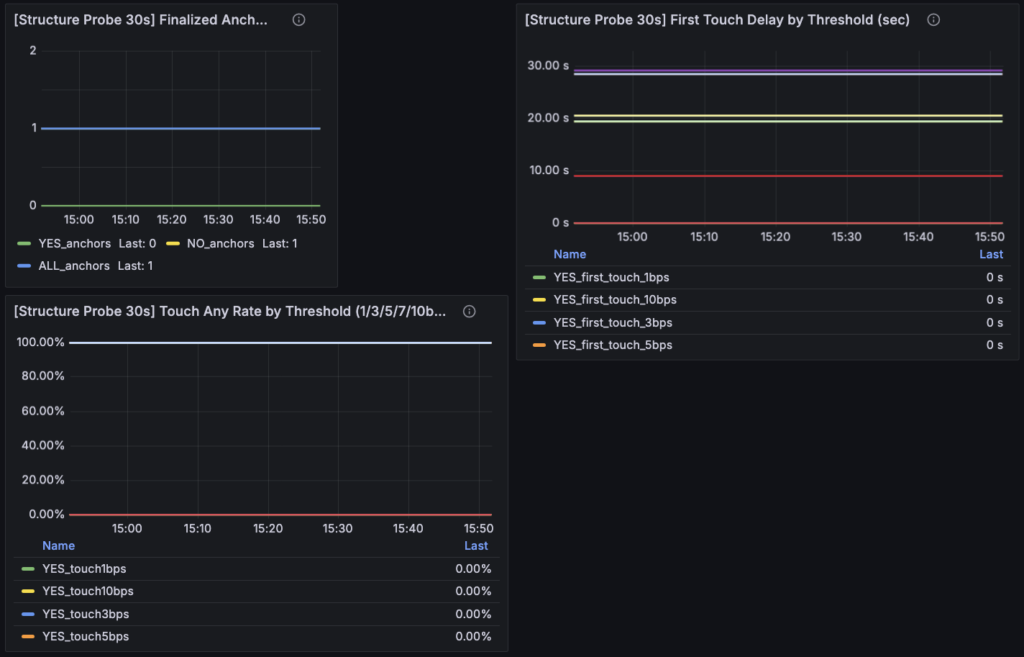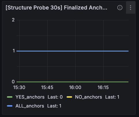 Grafana 側も、この思想に合わせて切り直しています。まず、パネル名の時点でかなり分かりやすくしていて、[Structure Probe 30s] Finalized Anchors (ALL/YES/NO) という名前に変えています。