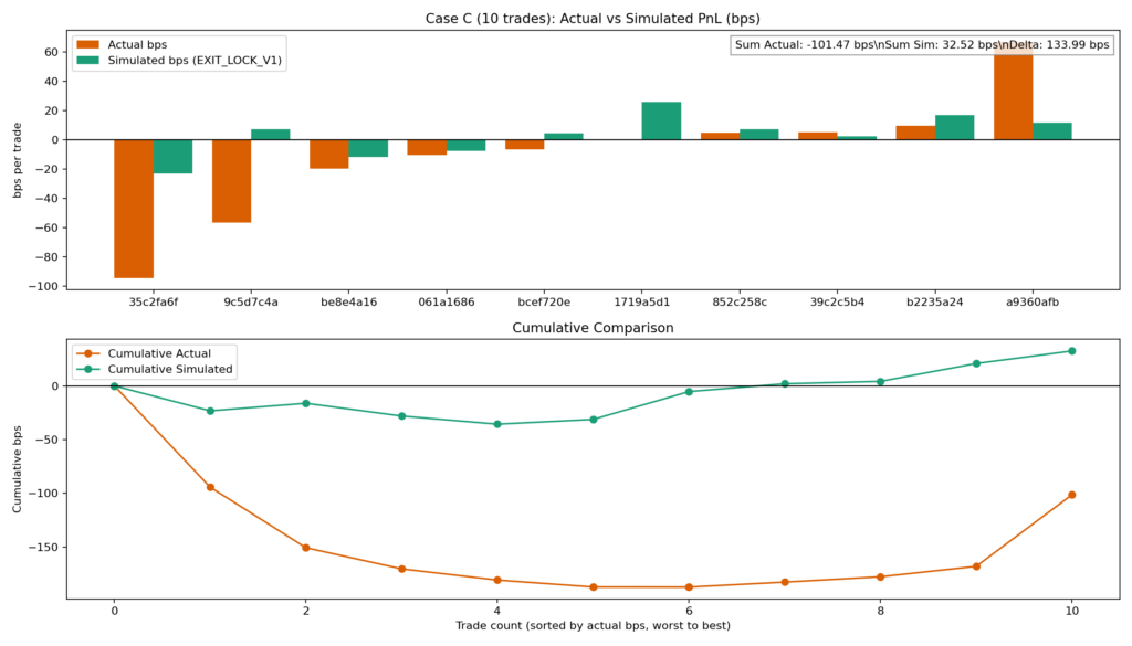 結論は単純ではありません。10トレードの再計算ではテール損失は大幅に改善し、勝ち毀損も確認されませんでした。しかし、サンプルは限定的であり、全期間での確証には至っていません。