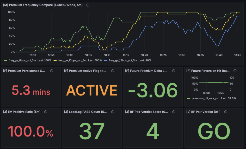 本記事では、この multi_market_probe の設計思想と実装について、できるだけ技術寄りに整理していきます。特に、premium を単なる価格差ではなく トレード可能性を評価するための状態量として扱うために、どのような観測指標と判定ロジックを用意したのかを中心に解説します。