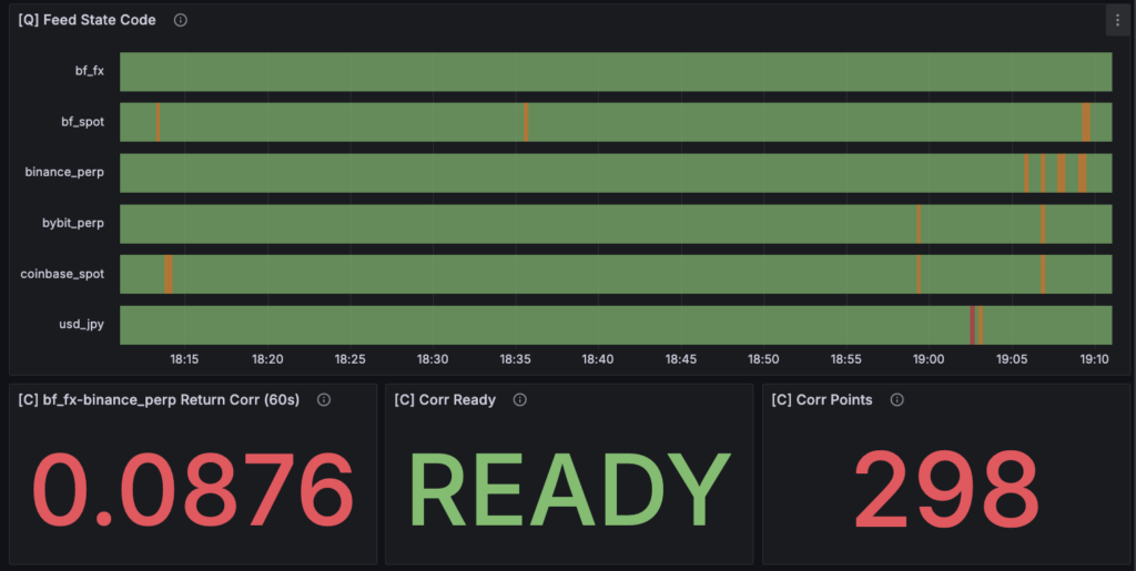 たとえば USD 建ての市場であれば、USDJPY を使って JPY に換算し、bitFlyer FX と直接比較できるようにします。また、データの鮮度や遅延も同時に記録し、「今見えている価格」がどれくらい信頼できるかも後段に渡しています。