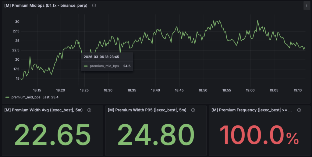 今回の開発では、その問いに答えるための観測bot「multi_market_probe」を作っています。このボットはトレードを実行するためのものではなく、市場間の状態を観測し、戦略が成立する可能性を判定するための研究装置です。bitFlyer FX を基準に複数の市場を同時に観測し、価格差(premium)、その継続時間(persistence)、一定時間後の結果(future outcome)といった指標を記録しながら、市場間の構造を分布として捉えようとしています。