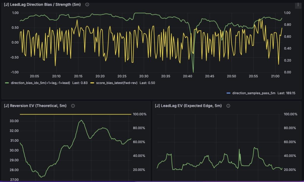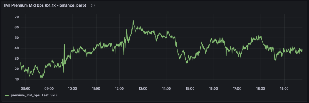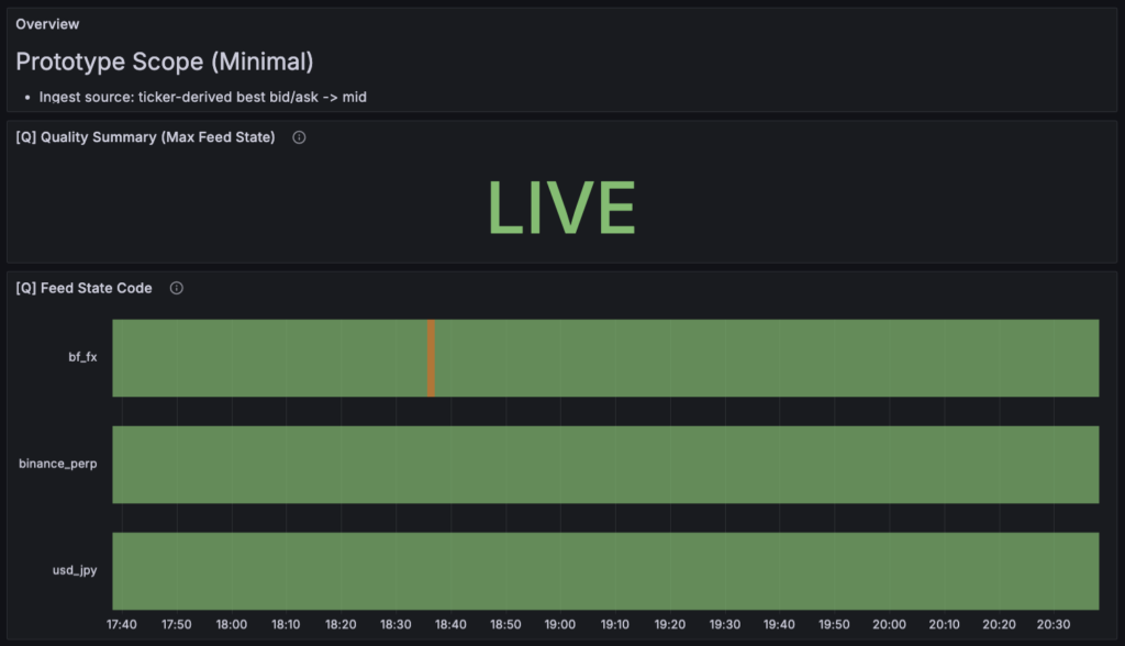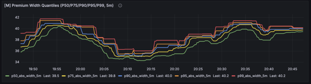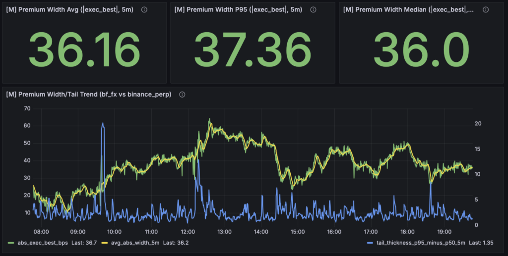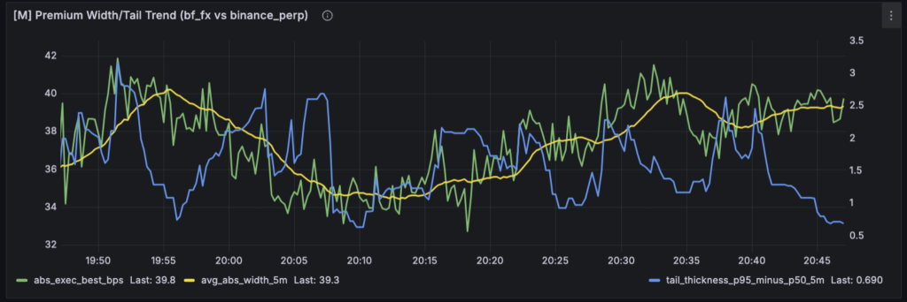 品質監視は「接続が維持されているか」「過度な遅延がないか」「更新が継続しているか」の3点に絞り、binance-perp の取得系は HTTP polling から WebSocket に切り替えて安定化させました。さらに M 系統では、premium を従来の閾値表示ではなく、width や quantile を含む分布として見えるようにしています。これによって、今その市場で何が“例外”で、何が“通常状態”なのかを、ようやく事実ベースで見られる形に近づけました。