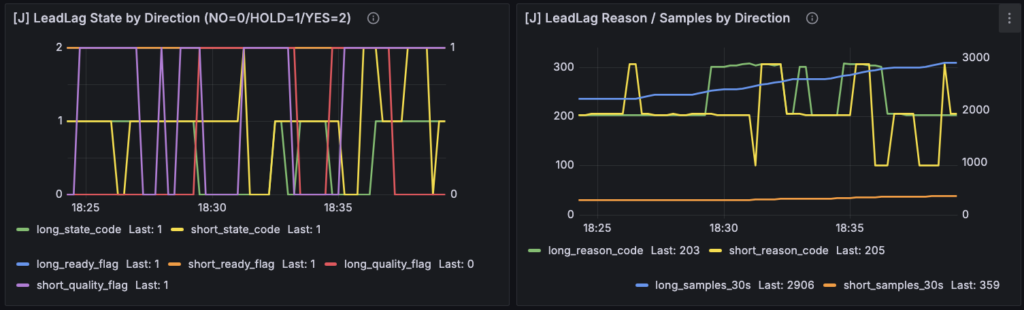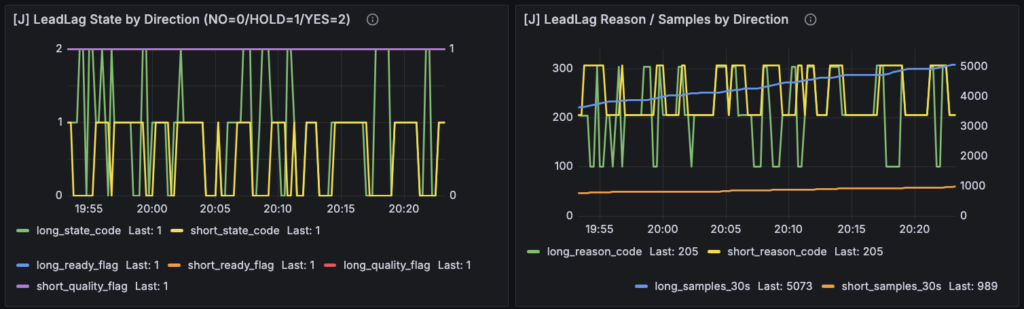 前回は J-Reversion を先に定義し直し、観測器 J 系統を「構造の白黒をつける層」として置き直しました。今回はその続きとして、これまで MMArbSignalEngine 側の診断系に留まっていた Lead-Lag を、J 系統の判定器として一旦形にしています。anchor の取り方、future outcome の持たせ方、YES / HOLD / NO の返し方を整理しつつ、Grafana 上で読めるところまで持っていった一方で、まだ解釈コストの高い部分も残っています。今回は、その目的と実装の要点、実際にやったこと、そして現在地をまとめます。