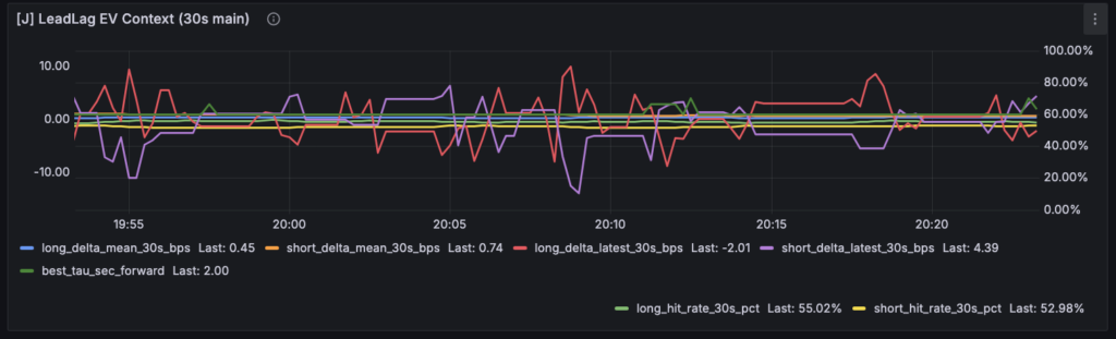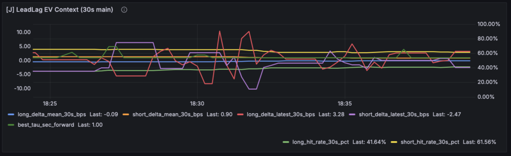 たとえば [J] LeadLag EV Context (30s main) は、現時点では情報を詰め込んだ確認用パネルとしては機能していますが、日常的に読むにはまだ少し厚いと感じています。hit_rate_30s_pct、delta_mean_30s_bps、delta_latest_30s_bps、best_tau_sec を同じ場所で見せているので、future facts と relation 補助情報が一枚に同居している状態です。