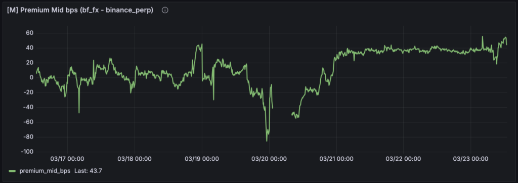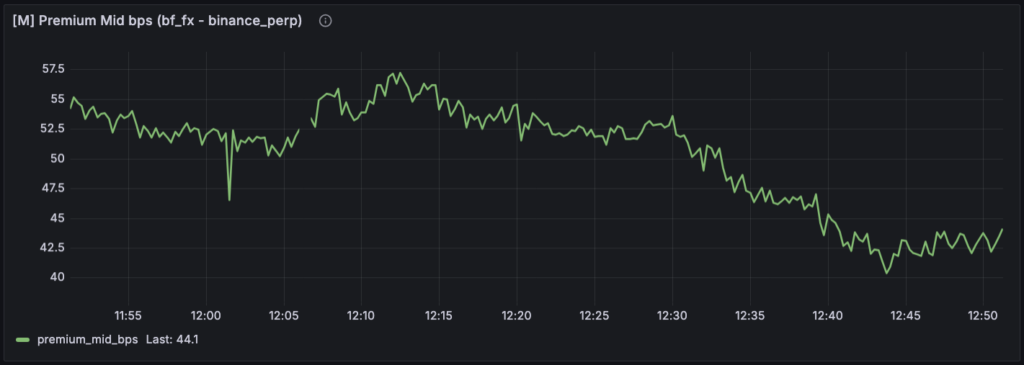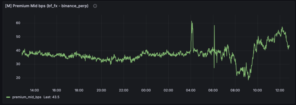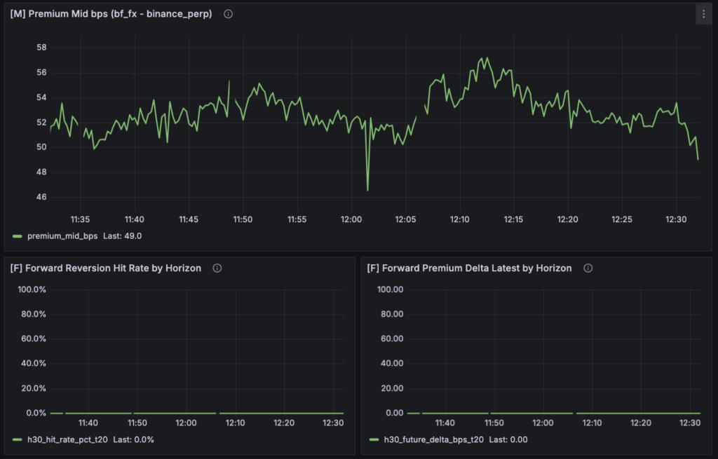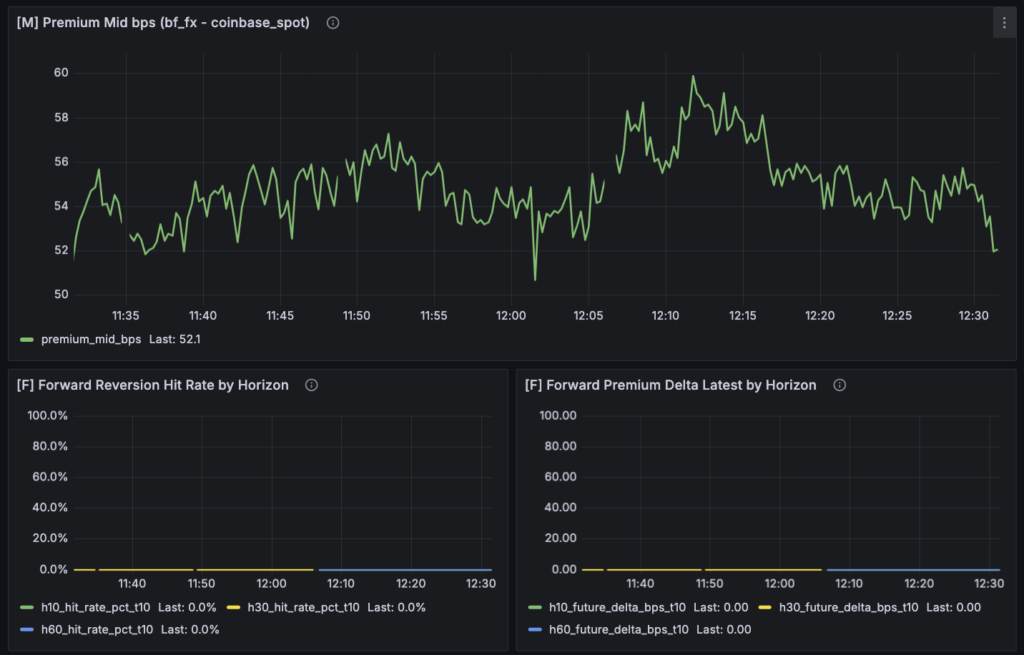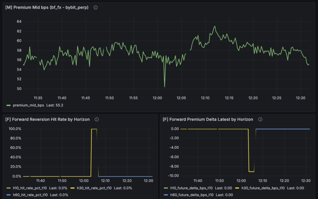 その一方で、M 系の [M] Premium Mid bps を見ると、かなり興味深い事実も出ています。binance_perp、bybit_perp、coinbase_spot をそれぞれ ref_market にしたグラフは、完全一致ではないにせよ、かなり似た形をしています。これは重要です。少なくとも現時点では、bf_fx に対する外部市場 3つの premium 変動は、バラバラというより、かなり共通した大きな波の上で動いているように見えます。つまり、「市場ごとにまったく別世界を見ている」というよりは、共通した世界価格ショックを、それぞれ少し違う水準と細部で反映している可能性が高い、ということです。
