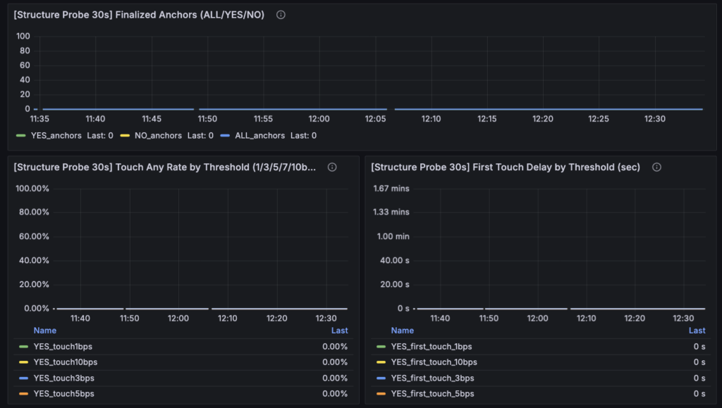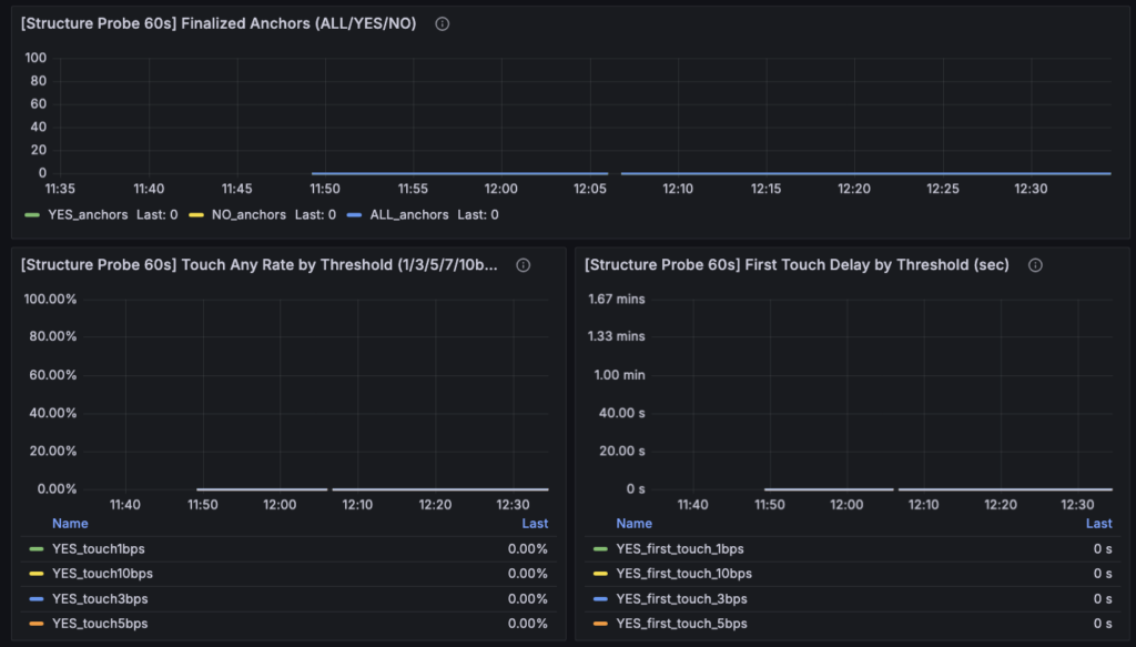 Structure Probe も同じです。30 / 60 / 90 / 120 秒まで拡張したことで、「どの時間幅で最初に母集団が立つのか」を同じ器で見られるようになりました。ただし、現段階では horizon 間の優劣を語れるほどサンプルはまだ溜まっていません。ここでの前進は、結論が出たことではなく、結論が出る前に比較可能な形へ揃えられたことです。30 秒だけを見て「弱い」と言っていた頃と違って、今は少なくとも「30 では弱いが 60 なら立つのか」「90 まで伸ばすとどうなるのか」を同じ枠組みで観測できます。これはかなり大きいです。