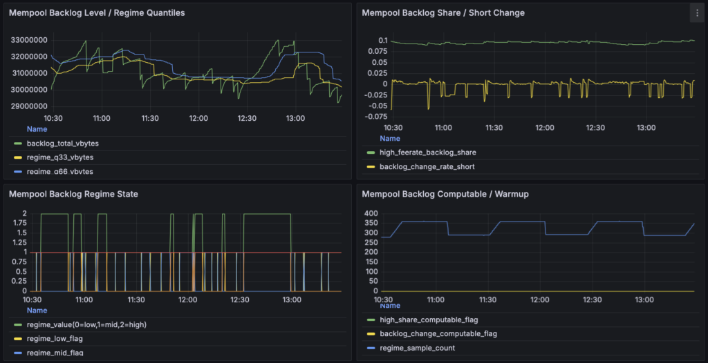 mempoolを補助状態タグとして観測機に追加すること自体には、それなりに意味があると思います。少なくとも、何も考えずに値を増やしているわけではなく、「市場の背景状態を粗く切る材料になるかもしれない」という仮説は一応あります。最小構成で実装して、過剰に作り込まず、まずは値が取れて並置観測できるところまで持っていく、という進め方も悪くなかったはずです。