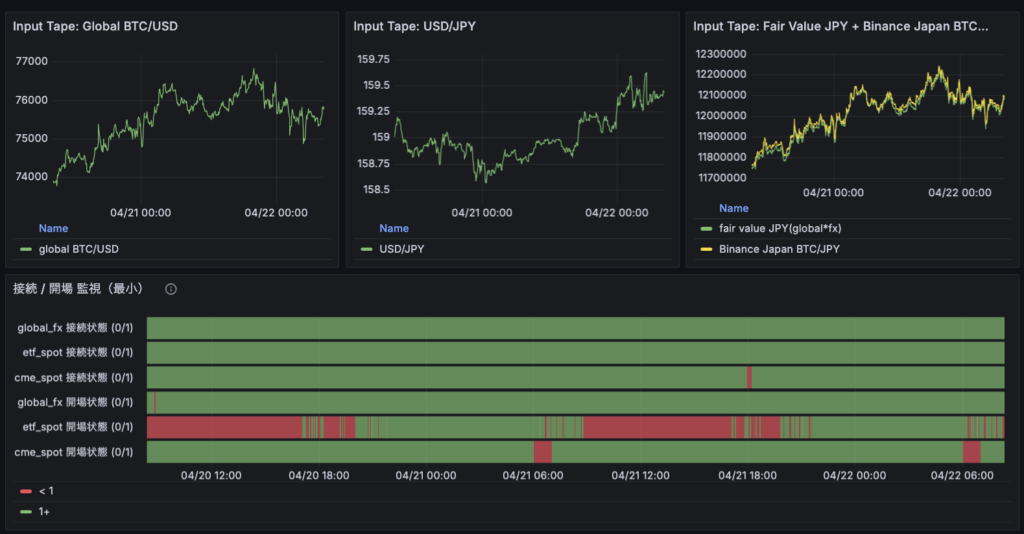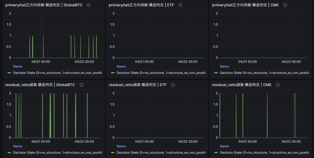 現時点では、GlobalBTC や CME と比べて、ETF は現行の lead-lag 定義の中でかなり無風に見えます。構造候補が見えている他の市場候補に対して、ETF 側はほぼ拾えていないように見えました。接続や基本的な稼働自体が止まっているわけではなさそうなので、「データが来ていない」というよりは、「今の定義では捕まえられていない」と読むほうが自然そうです。