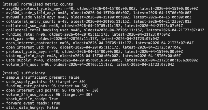 最新時刻も Ethena と Hyperliquid の両方で進んでおり、定期実行そのものは止まっていません。さらに、sample_insufficient_present: False、shock_decile_ready: True、forward_event_ready: True、still_data_hungry: False となっており、少なくとも「完全な母数不足で何も読めない」段階は抜けています。